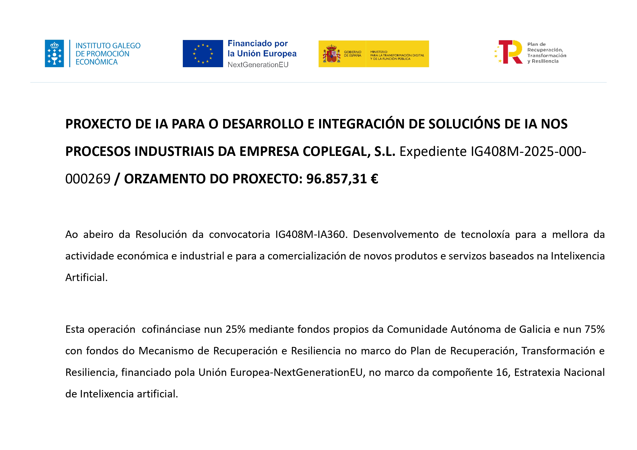 En Coplegal seguimos avanzando con firmeza hacia un modelo de trabajo más innovador, ágil y competitivo. Nuestra apuesta por la transformación digital se refuerza ahora con un nuevo impulso: la puesta en marcha de un proyecto de inteligencia artificial apoyado a través del programa IG408M–IA360, orientado a modernizar procesos industriales mediante tecnologías avanzadas.
